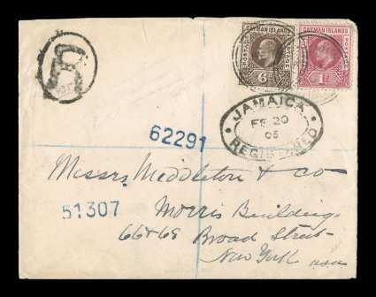 2090 c S.G. #4, 6 imageS.G. #4, 6, 1902-03 1p Carmine and 6p Brown, tied to scarce double-rate registered cover to the United States from the Middleton & Co. correspondence by "Grand Cayman/Cayman Islands/FE 15 05" double circle c.d.s., Type 3a pmk. of Georgetown, Jamaica registry oval, Boston transit, backstamped New York, trivial edge tear at top, very fine; the 7p franking pays two times the 2 1/2p foreign letter rate an 2p registry fee (Scott #4, 6). (Image) Est. 500-750