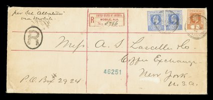 2091 c S.G. #5, 7 imageS.G. #5, 7, 1902 2 1/2p Bright blue horizontal pair and 1/- Orange, both tied to business size registered wax-sealed linen cover to a member of the Coffee Exchange in New York by "Grand Cayman/Cayman Islands/AU 18 02" c.d.s., Type 3a pmk. of Georgetown, instructions at top left give an unusual routing "per Sch. 'Albatross'/via Mobile", a Mobile, Ala. registry label has been applied, backstamped New York, couple minor surface scuffs, not affecting stamps or markings, very fine commercial cover; the 1/- value is very rare on commercial cover, this franking paid six times the 2 1/2p foreign letter rate plus 2p registry fee (Scott #5, 7). (Image) Est. 750-1,000