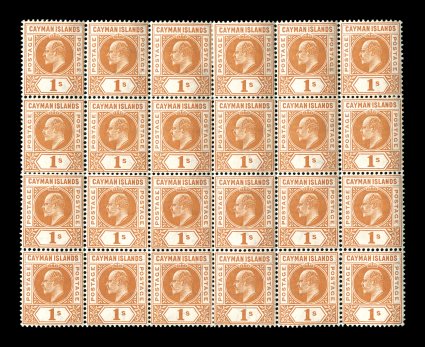 2096 og/nhbl S.G. #12 imageS.G. #12, 1905 1/- Orange, exceptionally well centered mint block of 24 (6x4), rich deep color, o.g., h.r. on the top center pair, the rest are n.h., very fine-extremely fine; a scarce high value multiple (Scott #12; $900.00+ for hinged). (Image) for hinged £768+