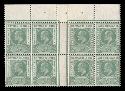 2099 og/nhbl S.G. #8, 8a imageS.G. #8, 8a, 1905 1/2p Green, dented frame variety, position L 1/6, in a top margin gutter block of eight, the variety being the second stamp from the left at top, o.g., some weak vertical perforations with minor hinge reinforcement, the variety is n.h., very fine; a nice position piece that established the position of the Glover flaw (Scott #8, 8 var.). (Image) for hinged £181+