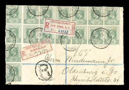 2101 O S.G. #8, 8a imageS.G. #8, 8a, 1905 1/2p Green, dented frame variety, an impressive appearing registered cover front with sixteen 1/2p including a block of twelve, strip of three and a single, the single at bottom left is the dented framed variety, all tied by "George Town/Grand Cayman/JU 12 07" c.d.s., Type 4 pmk., posted to Germany, Mobile and New York registry labels affixed, vertical fold along perfs. through the block, a very fine postal piece with this variety (Scott #8, 8 var.). (Image) Est. 200-300