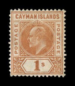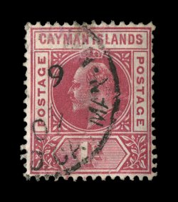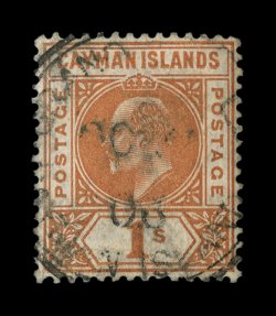 2112 O S.G. #12 imageS.G. #12, 1905 1/- Orange, used single with large portion of the "Grand Cayman/Cayman Islands/OC ? 06" double circle c.d.s., the rare Type 3b Georgetown pmk., an easily recognized type by its letters and spacing, very fine; this rare cancel was only used for about a month from September 29 to October 30, 1906 and is seldom encountered on or off cover (Scott #12). (Image) Est. 200-300