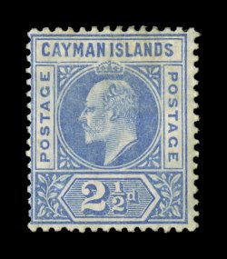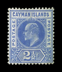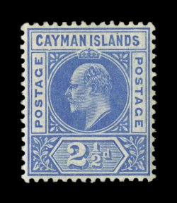 2107 og S.G. #10a, 10 var. imageS.G. #10a, 10 var. 1905 2 1/2p Bright blue, dented frame variety, position L 1/6, plus short first leg of "M" variety in "Cayman", this variety comes from position 5/3 of the duty plate and is found in both panes of the 2 1/2p value only, both are fresh, o.g., fine-very fine (Scott #10 var.). (Image) Est. 200-300