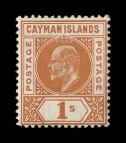 2109 og S.G. #12a imageS.G. #12a, 1905 1/- Orange, dented frame variety, position L 1/6, well centered mint single, o.g., h.r., very fine; only 74 stamps of this variety were printed (Scott #12 var.). (Image) £450