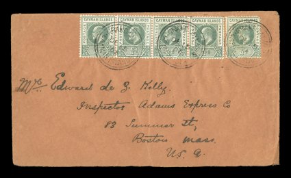 2113 c S.G. #8 imageS.G. #8, 1905 1/2p Green, single and horizontal strip of four paying the 2 1/2p foreign mail letter rate, all tied to commercial cover to Boston to the Inspector of the Adams Express Co. by "Grand Cayman/Cayman Islands/DE 15 05" double circle c.d.s., Type 3a pmk. of Georgetown, Kingston Transit c.d.s., backstamped Boston, minor creasing to the cover slightly affecting one stamp in the strip, fine and scarce cover with sole 1/2p franking (Scott #8). (Image) Est. 200-300