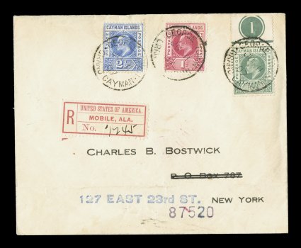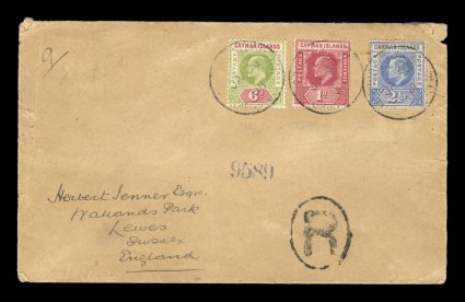 2114 c S.G. #8, 9, 10 imageS.G. #8, 9, 10, 1905 1/2p-2 1/2p King Edward VII second series, the three low values, including a plate number single of the 1/2p, tied to registered cover to the United States by "George Town/Grand Cayman/JU 11 07" c.d.s., Type 4 pmk., Mobile transit and registry label, backstamped New York, mild horizontal fold at bottom, very fine; an interesting example of an underpaid franking by 1/2p, the proper rate was 4 1/2p consisting of 2 1/2p for the foreign letter rate and 2p registry fee (Scott #8, 9, 10). (Image) Est. 300-400