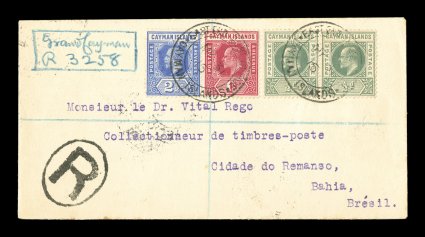 2120 c S.G. #10, 14, 26 imageS.G. #10, 14, 26, 1905 2 1/2p Bright blue and 1907 6p Olive and rose tied to registered cover to cover to England, along with later 1907 1p Carmine of the Postage and Revenue series, all tied by "George Town/Grand Cayman/JA 30 08" c.d.s., Type 4 pmk., routed through Cuba with Havana and London transits, backstamped Lewes, cover opened out for display, edge faults not affecting the stamps or markings; an interesting triple rate cover using stamps from three different Edward series and that is also 4 1/2p overpaid because the foreign letter rate (3x2 1/2p) was used rather than the Empire letter rate (3x1p) which was required (Scott #14, 22, 23). (Image) Est. 300-400