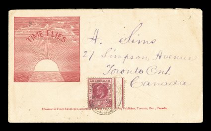 2116 c S.G. #9 imageS.G. #9, 1905 1p Carmine, gutter margin single tied to illustrated religious tract envelope paying the empire 1p rate to (Reverend) Sims in Toronto, Canada, tied by "Cayman Brac/Cayman Islands/JY 14 06" c.d.s., Type 2 pmk. of Stake Bay, Kingston transit, backstamped Toronto, very fine; advertising covers are very scarce at this period from the Caymans and particularly so from the this scarcer smaller Island (Scott #9). (Image) Est. 500-750