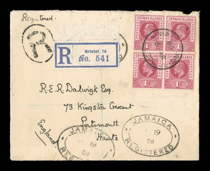 2117 c S.G. #9 imageS.G. #9, 1905 1p Carmine, well centered block of four on registered cover to England, central "George Town/Grand Cayman/MY 9 08" c.d.s., Type 4 pmk., just tying through the perforations, three strikes of Jamaica registry oval with Bristol registry label affixed over one, Bristol transit, backstamped Portsmouth, opened out for display, very fine; an apparently non-philatelic use with the block paying two times the 1p Empire letter rate and 2p registry fee, attractive and scarce cover; ex-Edmondson, Prappas (Scott #9). (Image) Est. 200-300