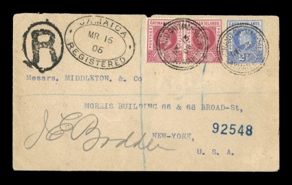 2118 c S.G. #9, 10 imageS.G. #9, 10, 1905 1p Carmine pair and 2 1/2p Bright blue, tied to registered commercial cover to the United States from the Middleton & Co. correspondence, by "Grand Cayman/Cayman Islands/Mr 13 05" double circle c.d.s., Type 3a pmk. of Georgetown, Jamaica registry oval, backstamped New York, backflap torn along top in opening not affecting the stamps or markings, very fine; this cover illustrates the proper U.P.U. foreign letter rate and registration; in previous collections this was identified as a first series Edward VII cover (S.G. #4, 5), but Mr. Maisel properly recognized it as a very early usage of the second series; ex-"Rew", Edmondson and Prappas (Scott #9, 10). (Image) Est. 400-500