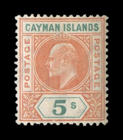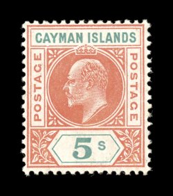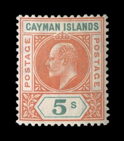 2154 og S.G. #16a imageS.G. #16a, 1907 5/- Salmon and green, dented frame variety, position L 1/6, a lovely fresh single of this very rare variety, featuring brilliant colors, well centered, o.g., lightly hinged, very fine; this is the rarest regularly issued value of the King Edward series with the Glover flaw, from the printing totals it is known that only nineteen stamps of this variety were printed and in all likelihood this is one of only two or three that still exist; 1995 BPA certificate; ex-Marston, Cooley (Scott #16 var.). (Image) £2,250