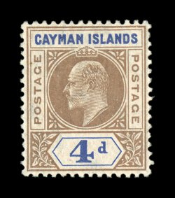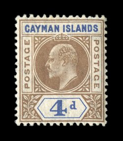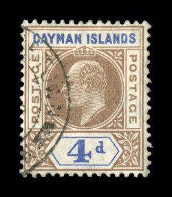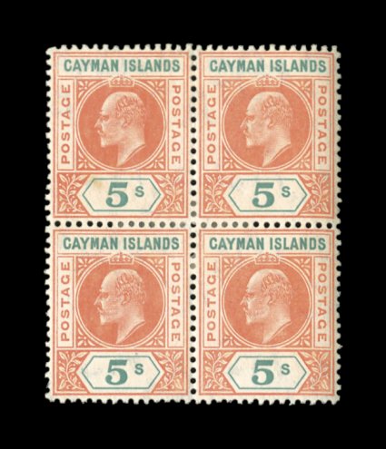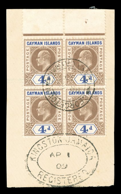 2149 Obl S.G. #13, 13a imageS.G. #13, 13a, 1907 4p Brown and blue, dented frame variety in a top margin block of four, positions L 1/5-6, 2/5-6, the variety being the top right stamp, tied to piece of registered cover by "Georgetown/ Grand Cayman/MR 29 09" double-arc c.d.s., Type 5 pmk., also tied by "Kingston Jamaica/registered/AP 1 09" double-ring oval, fresh and well centered, very fine and exceedingly choice; a lovely used block that is not only scarce in its own right but incredibly rare with the Glover flaw and quite possibly the only known example in a used block of four (Scott #13, 13 var.). (Image) £780+