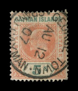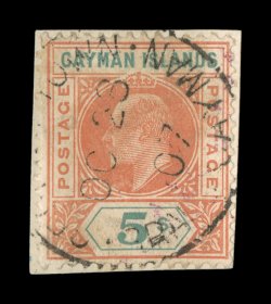 2145 O S.G. #16 imageS.G. #16, 1907 5/- Salmon and green, attractive used single tied to small piece by large portion of "George Town/Grand Cayman/OC 28 07" c.d.s., Type 4 pmk. of Georgetown, well centered with nice color, very fine and choice (Scott #16; $350.00). (Image) £300