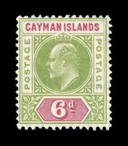 2150 og S.G. #14a imageS.G. #14a, 1907 6p Olive and rose, dented frame variety, position L 1/6, attractive mint single with bright colors, well centered, o.g., quite lightly hinged, very fine; a rare variety with only 42 examples of this variety printed (Scott #14 var.). (Image) £375
