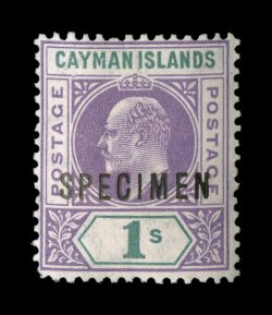 2152 S S.G. #15aS imageS.G. #15aS, 1907 1/- Violet and green with "Specimen" overprint, dented frame variety, position L 1/6, fresh example with bright colors, o.g., n.h., very fine; only one position in each double-pane sheet of 120 has this Glover plate flaw making this incredibly rare on a "Specimen" overprint with only seven or eight examples issued (Scott #15S var.). (Image) Est. 750-1,000