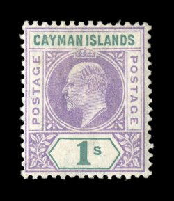 2153 og S.G. #15a imageS.G. #15a, 1907 1/- Violet and green, dented frame variety, position L 1/6, fresh mint single, bright colors, very fine; an exceptionally scarce variety with only 40 examples originally printed (Scott #15 var.). (Image) £500