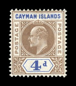 2147 og S.G. #13a imageS.G. #13a, 1907 4p Brown and blue, dented frame variety, position L 1/6, an exceptionally well centered mint single, fresh with bright color, o.g., lightly hinged, choice very fine; a scarce variety with only 48 of this variety originally printed (Scott #13 var.). (Image) £375