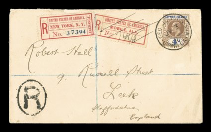 2158 c S.G. #13 imageS.G. #13, 1907 4p Brown and blue, single franking on registered cover to England, tied by "George Town/Grand Cayman/JY 3 07" c.d.s., Type 4 pmk., Mobile registry label crossed off when a New York label was applied, transit postmarks of both cities on the reverse, backstamped Leeks, addressee's manufactures agent printed corner card on the backflap, tiny edge piece out at top, very fine; this franking would cover the double Empire letter rate of 1p plus 2p registry fee. (Scott #13). (Image) Est. 400-500