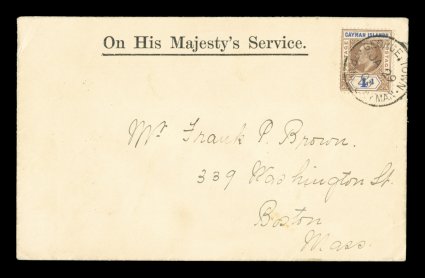 2159 c S.G. #13 imageS.G. #13, 1907 4p Brown and blue, single franking tied to an "On His Majesty's Service" cover to Boston by clear "George Town/Grand Cayman/JA 29 08" c.d.s., Type 4 pmk., Kingston transit on the reverse, an overall clean and fresh example of this official posting, very fine; this is an interesting cover that illustrates the shortage of low value stamps during this period as the proper rate was the 2 1/2p letter rate, this cover was overpaid by the postmistress, who certainly knew the rate; the shortage of 2 1/2p stamps resulted in the provisional "2 1/2p" surcharge on this value two weeks later. (Image) Est. 300-400