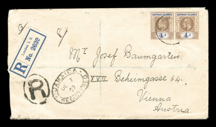 2160 c S.G. #13 imageS.G. #13, 1907 4p Brown and blue, horizontal pair tied to registered double-rate cover to Vienna, Austria by typically indistinct Type 4 c.d.s. of Georgetown, a Jamaica registry oval and London registry label on the front with two different transits of that city on the reverse, backstamped, two vertical folds and mild edge wrinkles, not affecting the stamps or markings, a fine commercial usage; the pair pays two times the 2 1/2p foreign letter rate and 2p registry fee, being 1p overpaid at a time when low values were in short supply (Scott #13). (Image) Est. 300-400