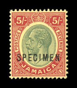 3217 ogS S.G. #58s-67s imageS.G. #58s-67s, 1912-20 1p to 5/- King George V, with overprinted "Specimen" cplt., brilliant colors, o.g., some minor h.r.'s, 2 1/2p with trivial corner crease, fine-very fine (Scott #61S-70S). (Image) £200