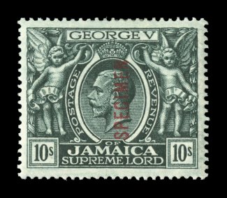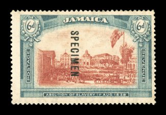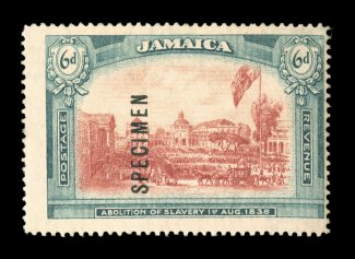 3220 ogS S.G. #89 footnote imageS.G. #89 footnote, 1921 6p Abolition of Slavery, wmk. script CA, with overprinted "Specimen", rich colors, o.g., lightly hinged, very fine; similar to the above stamp, but in the script CA watermark (Scott #87 footnote). (Image) £700