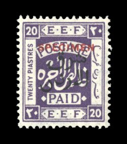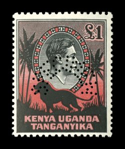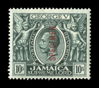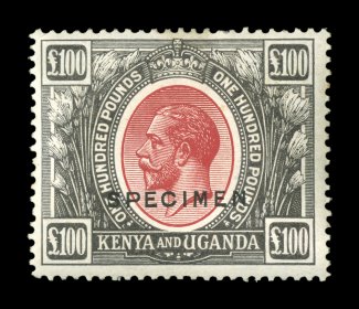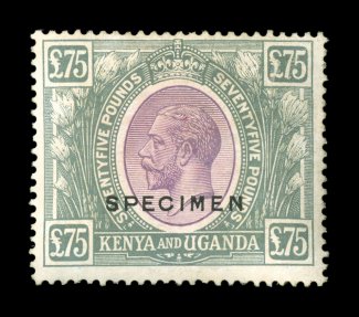 3234 ogS S.G. #104s imageS.G. #104s, 1925 £75 Purple and grey, with overprinted "Specimen", attractive colors, o.g., nearly very fine; this value and the following £100 are virtually unobtainable except as a specimen stamp (Scott #41ES). (Image) £800