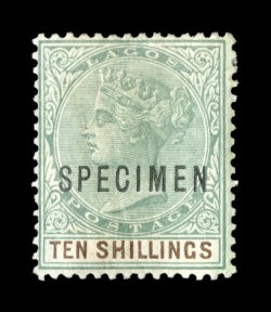 3241 ogS S.G. #30s-41s imageS.G. #30s-41s, 1887-1902 2p to 10/- Queen Victoria, with overprinted "Specimen" cplt., bright colors, o.g., (2p, 4p and 5/- small part o.g.), 3p with nibbed perfs. at right, 5p with small spot on face, fine-very fine (Scott #18S/38S). (Image) £275