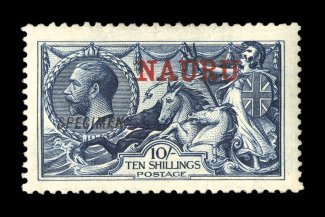 3307 ngS S.G. #18s imageS.G. #18s, 1916 10/- Indigo blue, with overprinted "Specimen", deep intense color and impression on crisp white paper, regummed, very fine; a rare specimen stamp (Scott #15cS). (Image) £1,000