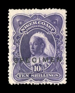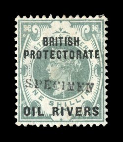 3314 ogS S.G. #1s-6s imageS.G. #1s-6s, 1892 1/2p to 1/- "Oil Rivers" overprints, with handstamped "Specimen", strong rich colors, o.g., some with light toning on the reverse, fine-very fine; a seldom offered specimen set (Scott #1S-6S). (Image) £275