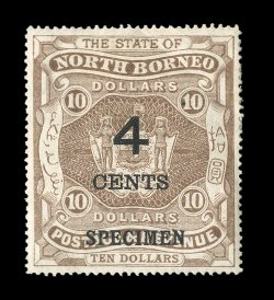 3320 ogS S.G. #112s-24s imageS.G. #112s-24s, 1899 "4 CENT" Surcharges, with overprinted "Specimen" cplt. including the three unissued values, for a total of fifteen stamps, o.g., most lightly hinged, $10.00 with light crease, otherwise fine-very fine (Scott #91S-102S). (Image) £300