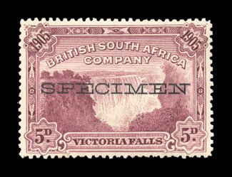 3350 ogS S.G. #94s-99s imageS.G. #94s-99s, 96as, 1905 1p to 5/- Victoria Falls, with overprinted or perforated "Specimen" cplt., including both 5p varieties, bright colors, o.g. except perforated 5p no gum, very fine (Scott #76S-81S). (Image) £550