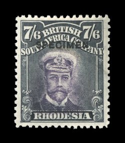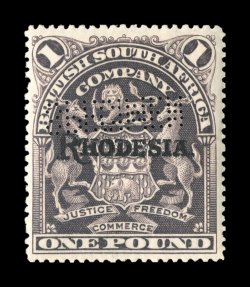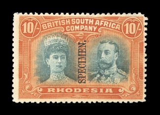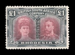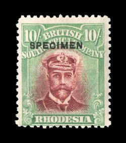 3351 ogS S.G. #100s-18s imageS.G. #100s-18s, 1909-12 1/2p-£1 "Rhodesia" overprints, with perforated "Specimen" cplt. including the four surcharged stamps, bright colors, o.g., 7 1/2p Surcharge with small crease, fine-very fine (Scott #82S-100S). (Image) £530