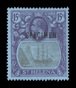 3369 ogS S.G. #91s-105s imageS.G. #91s-105s, 1921-30 1/2p to 5/- King George V, with overprinted "Specimen" cplt., strong colors, o.g. except 3p Purple on yellow no gum, fine-very fine (Scott #76S-89S). (Image) £300
