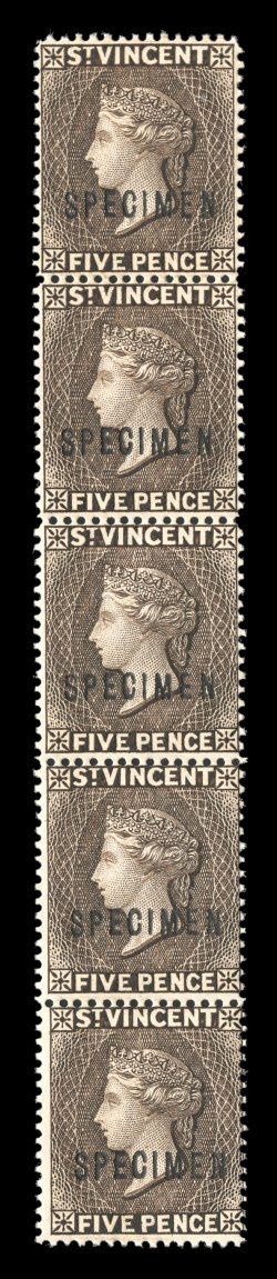 3372 ogS S.G. #61s-62s imageS.G. #61s-62s, 1897 2 1/2p-5p Queen Victoria, with overprinted "Specimen" cplt. in pristine vertical strips of five, marvelously fresh color, o.g., never hinged, very fine; specimen stamps from this period were sent to foreign post offices in strips of five, with the receiving post office usually either separating the strips into singles or affixing the strips onto ledger sheets, and even when full strips remained intact, they were generally broken into singles by dealers to make sets, therefore it is very rare to still find intact strips in such choice condition as these (Scott #45S, 50S). (Image) for hinged £300+