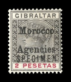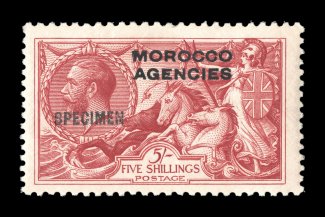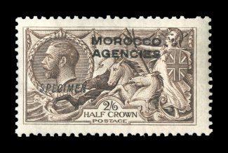 3025 ogS S.G. #50bs imageS.G. #50bs, 1914 2/6 Sepia brown, "Morocco Agencies" double overprint, one albino, with overprinted "Specimen", lovely rich color, o.g., lightly hinged, pulled perf. at top, otherwise very fine; a rare (if not unique) variety on the specimen stamp, unlisted in Stanley Gibbons. (Image) Est. 200-300