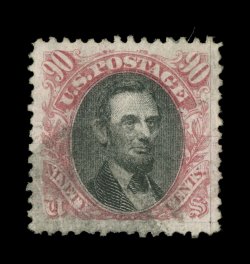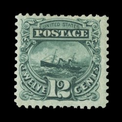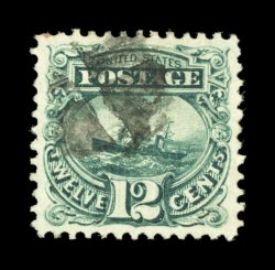 200 Ou 128 image#128, 12c Green re-issue, a fabulous quality example of this very rare used re-issue, being in a condition that is virtually unheard of on any of the known used 1869 Pictorial Re-issues, magnificently centered amid lavishly large margins, eye-arresting color in an incredibly deep shade, plus its impression is deeply etched on bright paper, superbly postmarked with a light magenta cancel at bottom, leaving the central vignette cancel free, a superb stamp for the finest used collection; Jon Rose, in his exceptional United States Postage Stamps of 1869 handbook, estimates that only 15-25 used Twelve Cent Re-issues exist and, in our opinion, there exists no finer than the copy offered here; 1991 and 2002 PF certificates as well as a 2005 PSE certificate (XF 90; SMQ $6,450.00); this is the highest grade the PSE has awarded a used #128, being one of only two to acheive this grade; ex-Morris, Hinrichs. (Image) $3,250.00