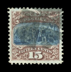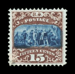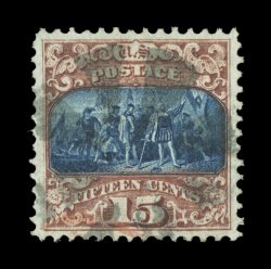 183 Ou 119 image#119, 15c Brown and blue, Ty. II, exceptionally well centered and margined, rich bright colors and well defined impressions, light segmented cork cancel and a small portion of a red transit pmk., extremely fine; 2001 PF certificate and a 2005 PSE certificate (XF 90; SMQ $650.00). (Image) $275.00
