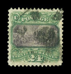 186 Ou 120 image#120, 24c Green and violet, exceedingly well centered within extravagantly large margins, beautiful rich colors and well incised impressions, light rosette cancel, extremely fine; an especially handsome and desirable used example; 1988 PF certificate and a 2006 PSE certificate (XF 90; SMQ $1,750.00). (Image) $775.00