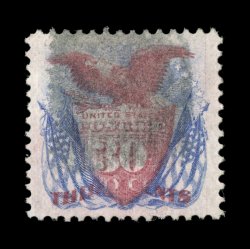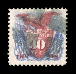 189 Ou 121 image#121, 30c Blue and carmine, used, well centered within extra-large margins, brilliantly rich colors and strong impressions, quartered cork cancel, extremely fine; 2003 PF certificate and a 2005 PSE certificate (VF-XF 85; SMQ $840.00). (Image) $550.00
