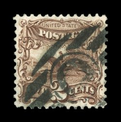 182 Ou 118 image#118, 15c Brown and blue, Ty. I, a highly desirable premium quality used example, possessing extraordinarily large margins all around and being marvelously well centered within them, rich colors and crisp impressions, quartered cork cancel, extremely fine; seldom seen this well margined; 2001 PF certificate and a 2005 PSE certificate (XF 90; SMQ $1,750.00). (Image) $750.00