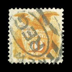 198 O 127 image#127, 10c Yellow re-issue, a highly desirable used single, possessing lavishly large margins all around and being exceptionally well centered within them, brilliant color, bold centrally struck double-oval registry pmk., extremely fine; a rare stamp in this gem used condition; 1999 PF certificate. (Image) $1,750.00
