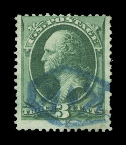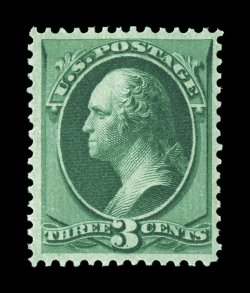 232 nhu 158 var. image#158 var., 3c Bluish green, a pristine mint single, possessing spectacular prooflike color and impression, well centered and margined, fresh o.g., never hinged, choice very fine; 2005 PSE certificate specifically identifying this as the Bluish green shade (VF 80; SMQ does not price this stamp in never hinged condition). (Image) for hinged $140.00