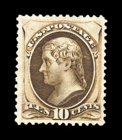 237 og 161 image#161, 10c Brown, excellent centering within uncharacteristically large margins, rich color and a crisp impression, full o.g., lightly hinged, most recent certificate mentions tiny stains at lower left which are quite trivial, otherwise extremely fine; clear 1997 PF certificate and a 2006 PSE certificate. (Image) $1,300.00