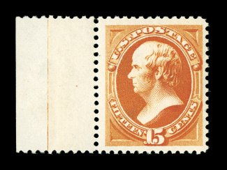 242 nh 163 image#163, 15c Yellow orange, an incredibly fresh and choice left sheet-margin single, being in a wonderfully pristine state of preservation, with deep vibrant color and a truly prooflike impression on crisp white paper, exceptionally well centered within lavishly large margins, but most impressive of all is the reverse, which sports full clean original gum that has never been hinged, extremely fine; the rarity of a certified never hinged example of #163 cannot be overstated, as this is the first example we have ever offered, and to our knowledge no finer never hinged example exists; 2006 PF certificate. (Image) for hinged $3,000.00