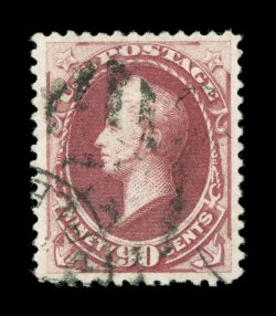 245 O 165 var. image#165 var., 30c Greenish black, a most impressive used example of this color variety, featuring extravagantly large margins all around and being remarkably well centered within them, sumptuously rich color and a well defined impression, fancy NYFM cancel and a small portion of a red transit postmark, extremely fine used gem; 2004 PF certificate. (Image) $130.00