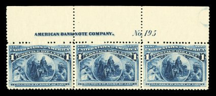 301 nh 230 image#230, 1c Columbian, remarkably choice full top margin imprint and plate "No. 195" strip of three, incredibly fresh, with especially deep luxuriant color and impression, wonderfully well centered, o.g., n.h., extremely fine; catalog value is for three never hinged singles; 1989 and 2001 PF certificates. (Image) $172.50+