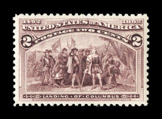 302 nhu 231 var. image#231 var., 2c Columbian, "broken hat" variety, marvelously well centered within large margins, incredibly fresh with gorgeous rich color and a strong impression on bright white paper, plus surrounded by crisp even perforations, unblemished o.g., n.h., extremely fine in every respect; a surprisingly difficult variety to acquire in gem status; 1992 PF certificate for a block of four and 2006 PSE certificate as a single (XF-Superb 95; SMQ $1,650.00); this is the highest grade awarded to date, being one of only three to be given this grade. (Image) $160.00