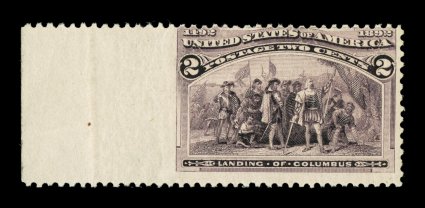 303 nh 231 var. image#231 var., 2c Columbian, imperforate between left selvage and stamp, fresh with deep color and strong detailed impression, the left selvage is exceptionally large making this all the more striking, o.g., never hinged, fine centering being just centered into the perfs at top; for some reason it is not Scott's policy to list stamps that are imperforate between the selvage and the stamp as impressive and rare as they might be, and certainly this stamp fits both of those characterizations, this is the only example of this variety of which we are aware and the first time we have ever offered it; a highly important variety and indispensable for anyone building a specialized collection of this value or the United States' first commemorative series for the Columbian Worlds' Fair; 2000 PF certificate. (Image) Est. 1,000-1,500