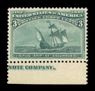 304 nhu 232 image#232, 3c Columbian, bottom sheet-margin partial imprint single, especially well centered within large balanced margins, strong rich color and a crisp detailed impression, pristine o.g., n.h., extremely fine and choice; 2002 PSE certificate (XF 90; SMQ $420.00). (Image) $150.00